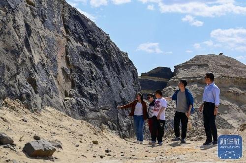 在新疆克拉玛依市乌尔禾区,游客在天然沥青矿参观游览(5月1日摄)。