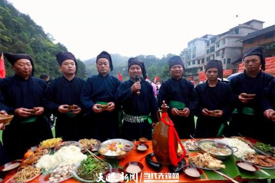 鼓藏节期间,村民在朗利苗寨的寨门口摆设了12道拦门酒和“高山流水”敬酒,迎接八方亲友。