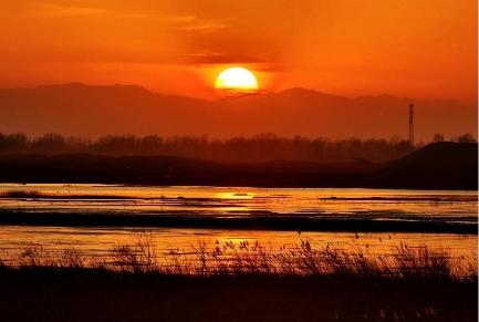 甘肃省武威市民勤县红崖山水库在晚霞的映衬下分外美丽。新华社发