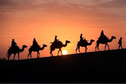 清晨,游客在甘肃省敦煌市鸣沙山月牙泉景区游览。新华社发(张晓亮 摄)