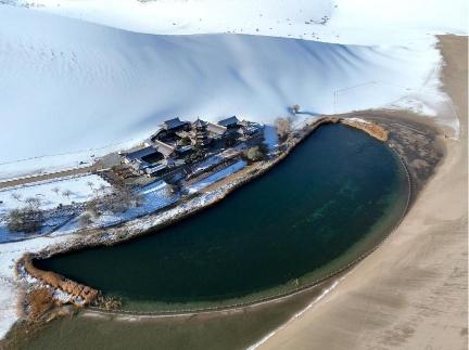 敦煌鸣沙山月牙泉景区雪景(无人机照片)。新华社发(张晓亮 摄)
