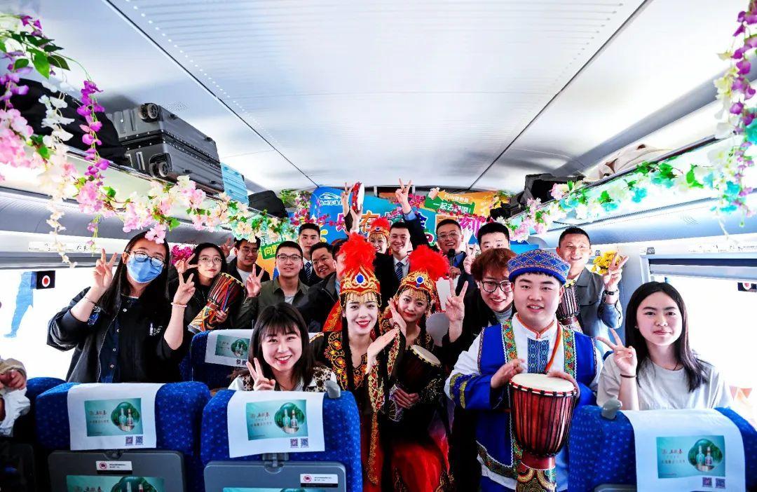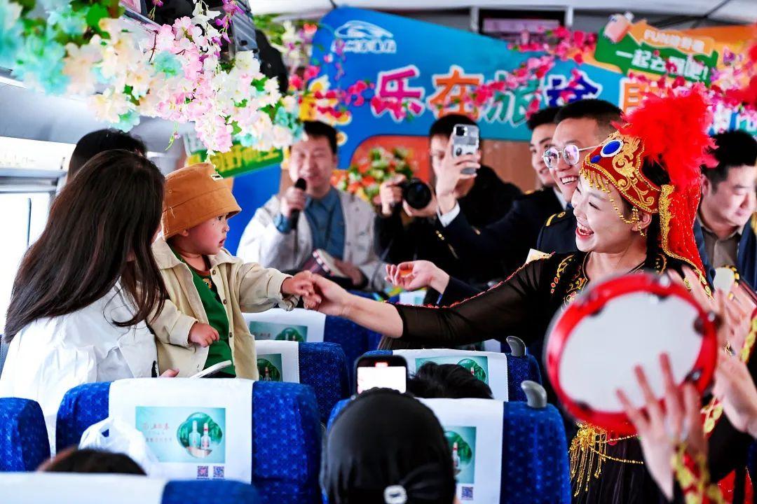 多才多艺的乘务员小姐姐换上纱裙,化身西域舞者在车厢中翩翩起舞,更有热情的旅客站起身随着乐曲与舞者联欢。身穿民族服饰拍打手鼓伴奏的列车员小哥哥也同样成为全场焦点,车厢中欢呼喝彩声连续不断。