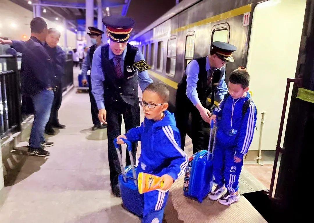 在吐鲁番站,一群可爱的小学生在老师们的带领下有序登上7557次列车,列车长蒋耀和乘务员西尔扎提·居来提在11号车厢门口帮孩子们把蓝色行李箱提上车。