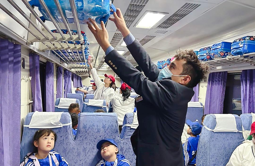 开车后,列车长蒋耀第一时间和带队老师沟通、了解情况,带队老师说他们一共有53名小学生、8名老师,从吐鲁番“研学”结束乘坐火车返回库尔勒。蒋耀给带队老师讲解了儿童乘车安全注意事项,又叮嘱他们在旅行期间如遇困难可以找他或乘务员帮助。