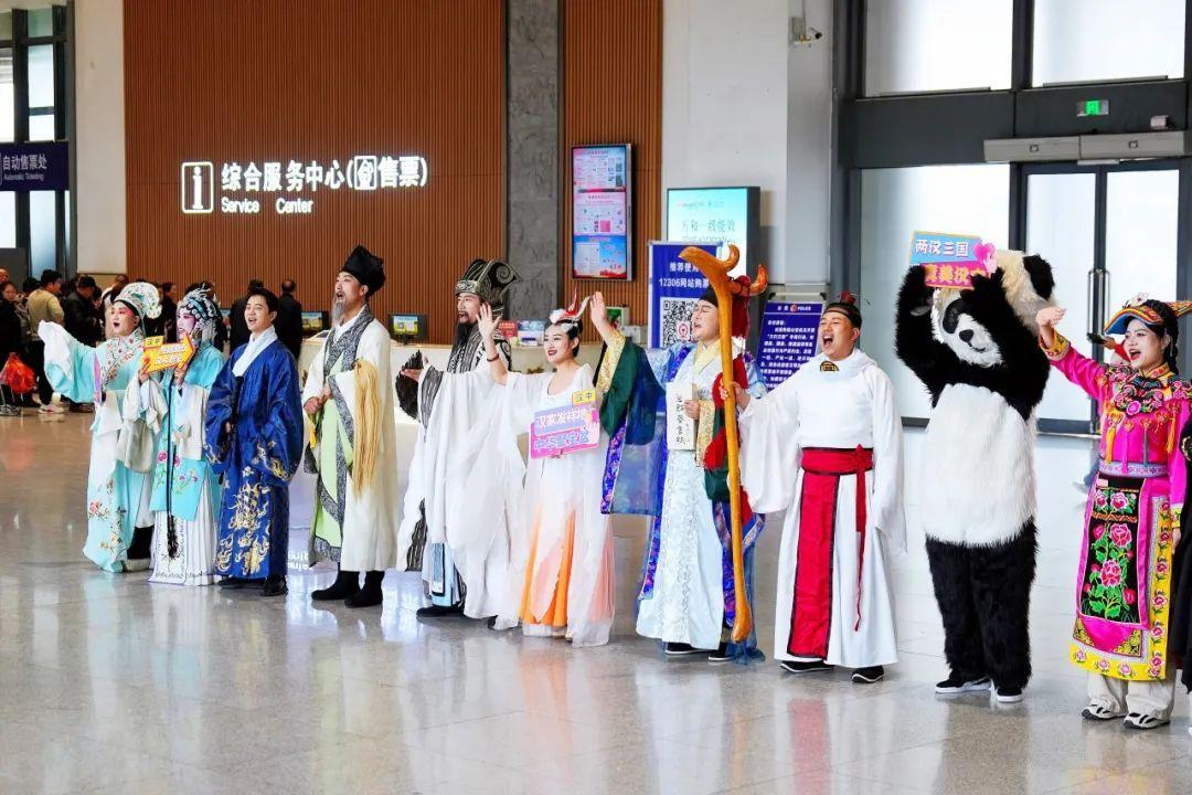 西安局集团公司与地方文旅局对接,组织张骞、刘邦、蔡伦等历史文化名人及秦岭四宝人偶、非遗汉调桄桄戏和羌族服饰演员组成的文旅IP在汉中站开展特色迎宾活动,在互动中引导旅客文明出行,展示地域文化。