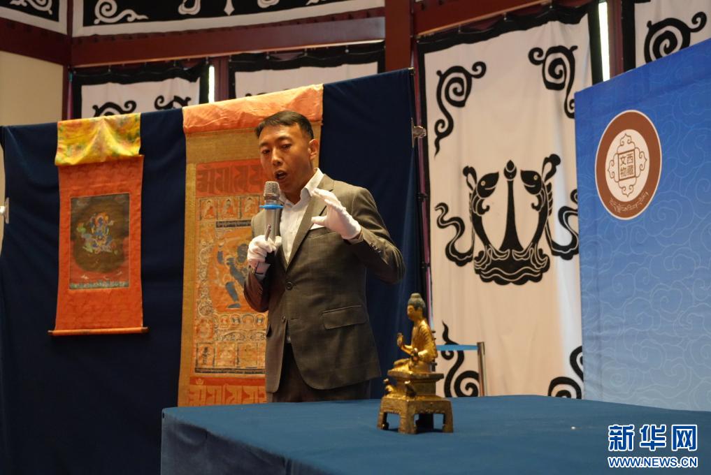 色莉玛向观众讲解“大慈法王唐卡”。(丹玉 摄)