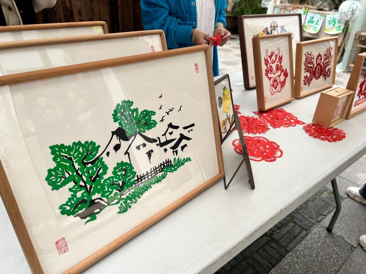 街区内,融入了湖州地方标识和潮流元素的剪纸(央广网见习记者 孙俊 摄)