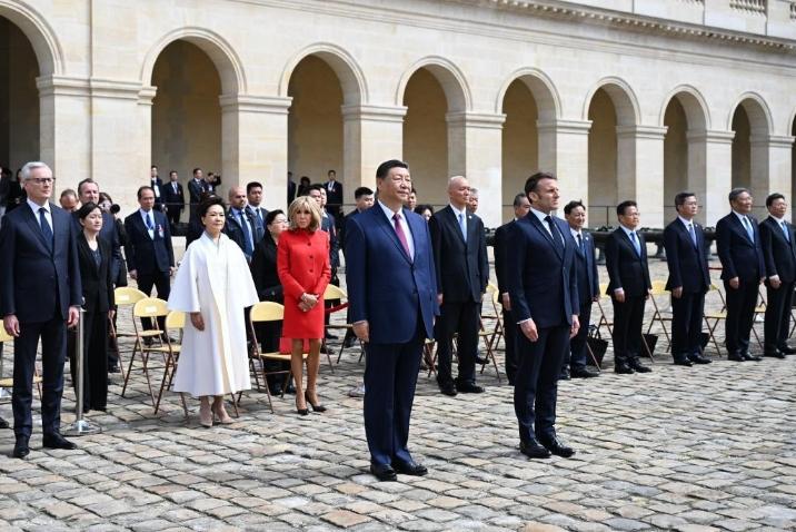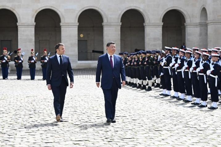 当天下午,习近平在巴黎出席马克龙举行的隆重盛大欢迎仪式。两国元首检阅法兰西共和国卫队和陆海空三军仪仗队,并观看分列式。