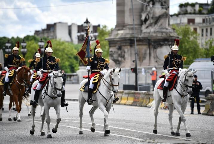 欢迎仪式后,习近平和夫人彭丽媛在共和国卫队148名骑兵组成的礼兵马队和摩托车队护卫下,乘车前往爱丽舍宫。