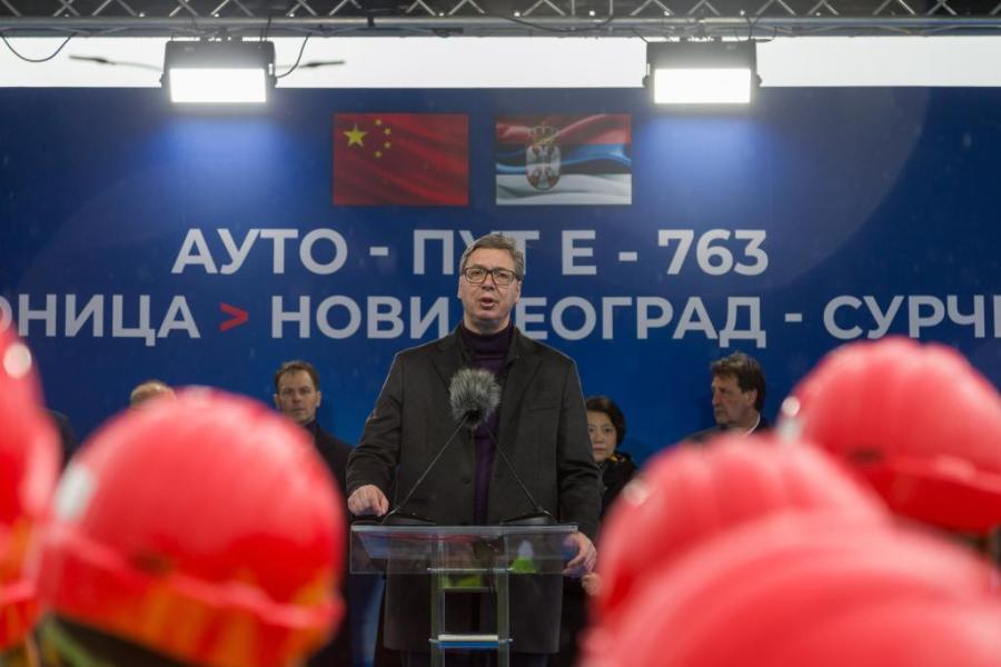 2023年4月1日,塞尔维亚总统武契奇在首都贝尔格莱德的塞尔维亚E763高速公路新贝尔格莱德-苏尔钦段通车仪式上致辞。新华社记者 石中玉 摄