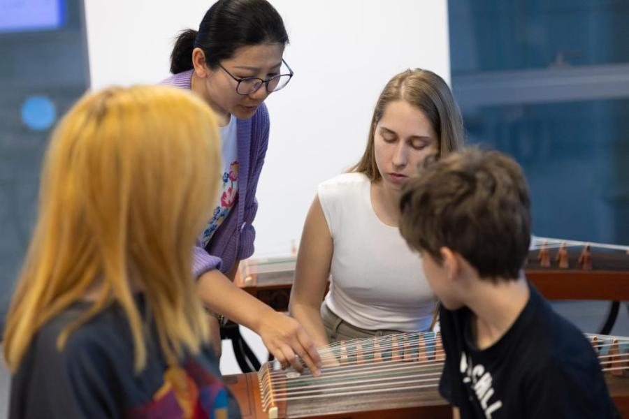 2024年4月29日,在塞尔维亚贝尔格莱德中国文化中心,古筝指导老师王宣(后左)在教学。新华社记者 李京 摄
