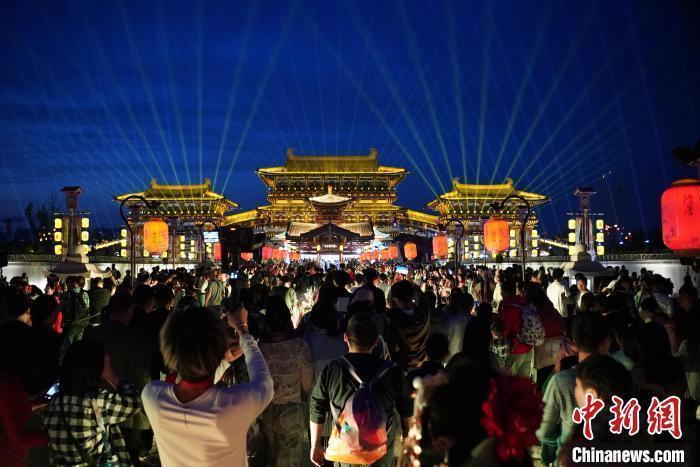 5月1日晚,游客在隋唐洛阳城九洲池御道驻足观看演出。牛林林 摄