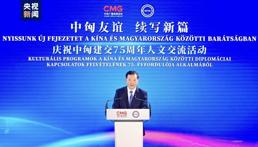 △中宣部副部长、中央广播电视总台台长慎海雄与匈牙利媒体支持与资产管理基金会总裁鲍普共同启动节目播出
