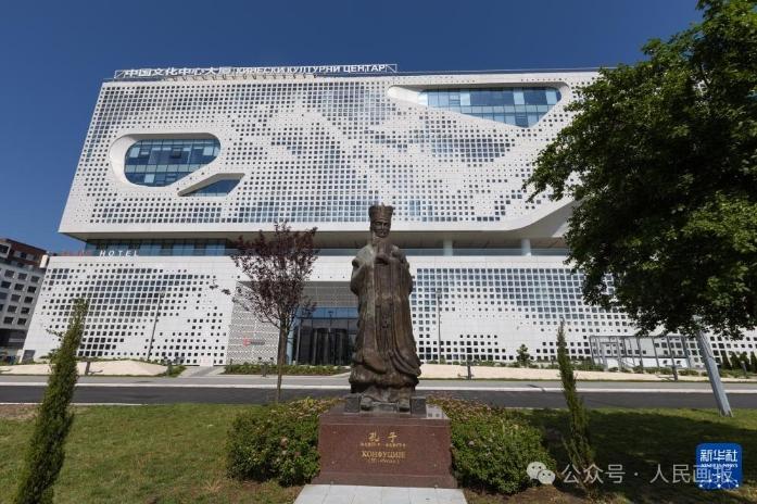 位于塞尔维亚贝尔格莱德的中国文化中心建筑及孔子像。2016年,习近平主席访塞期间与时任塞尔维亚总统尼科利奇共同出席中国文化中心奠基仪式。如今,中国文化中心开设中文、传统乐器、书法、太极等课程,成为当地民众了解中国和体验中华文化的一个窗口。图源:新华社