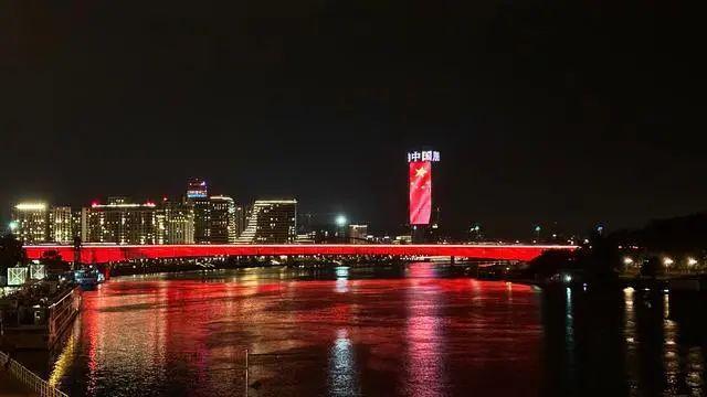 5月7日晚,贝尔格莱德亮起“中国红”。图源:新华社