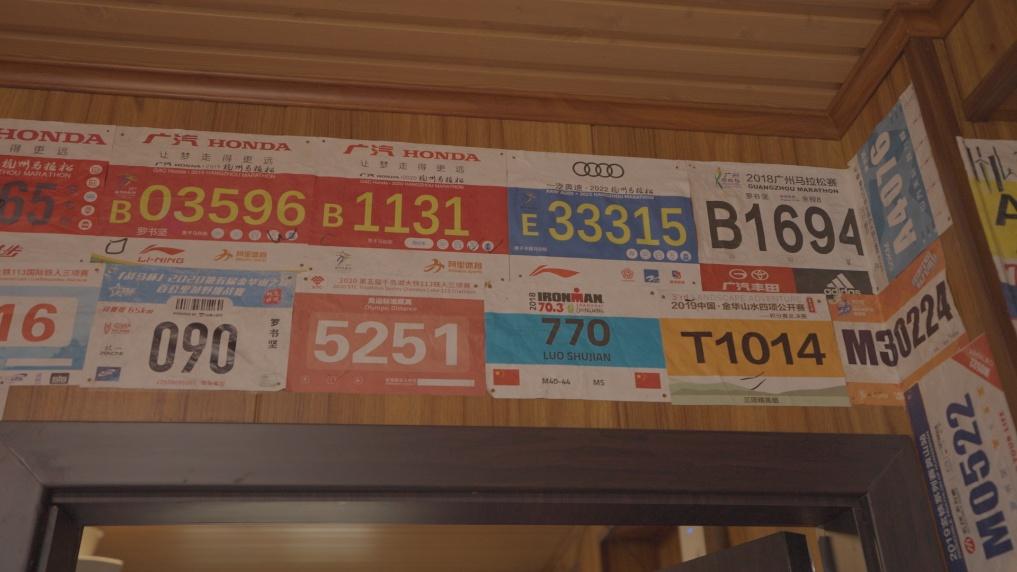 每次跑完马拉松,罗书坚都会把号码牌贴在墙上,那是他激励自己的一种特殊方式。