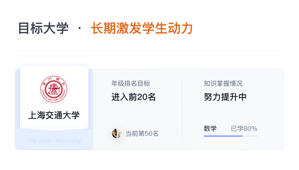 此外,学生一旦确定目标大学,系统即会生成考上目标大学所需完成的各学科、各知识点的学习任务,实时反馈任务进度百分比。有趣、实用的学习激励设计,大大增加抵达梦想学堂的几率。