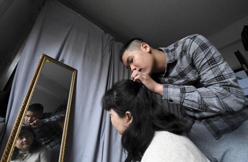 ↑在位于广西南宁市北湖北路的出租房里,阳阳帮妈妈何冬艳拔白头发(2023年3月31日摄)。