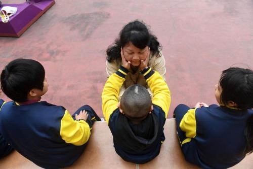 ↑在广西南宁高新区龙华学校,何冬艳和她照顾的学生在一起(2023年3月31日摄)。