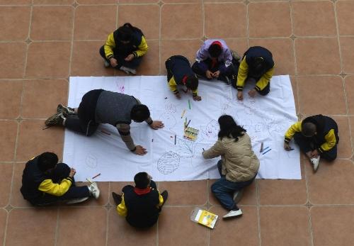 ↑在广西南宁高新区龙华学校,何冬艳教她照顾的学生画画(2023年3月31日摄)。