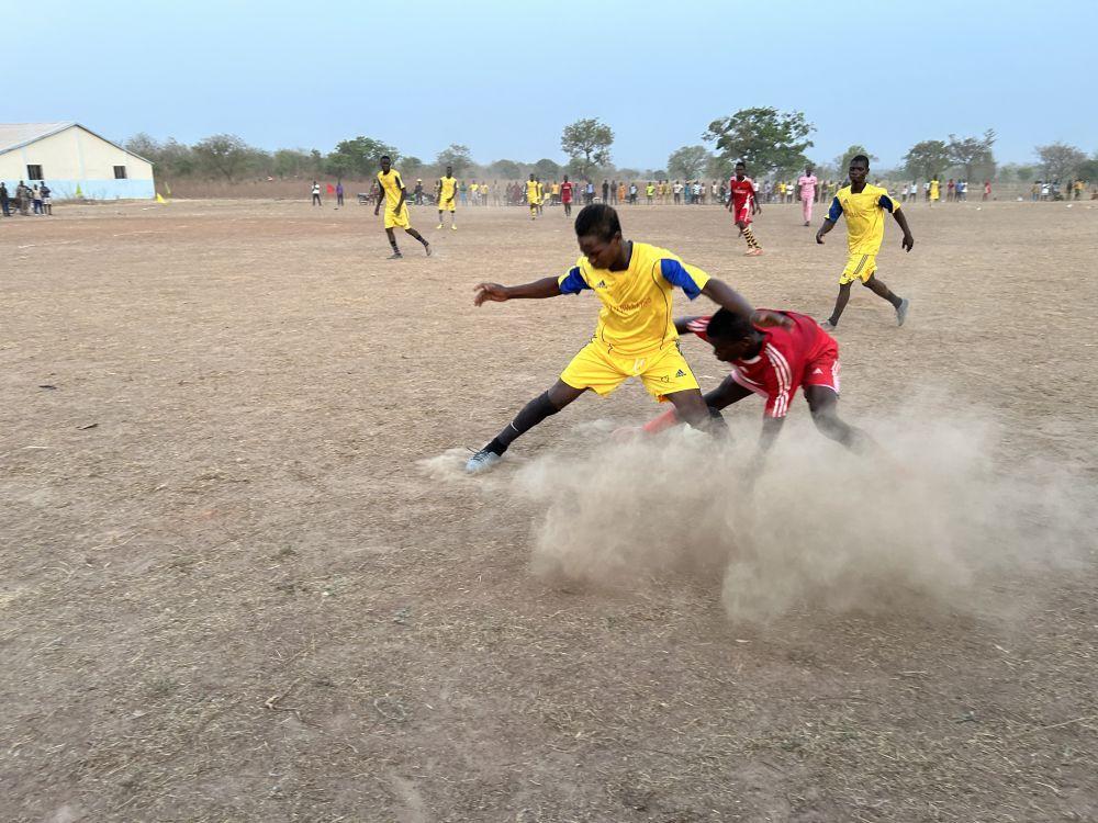 4月13日,贝宁当地村民球员正在非洲“村超”赛场上踢球。受访者供图
