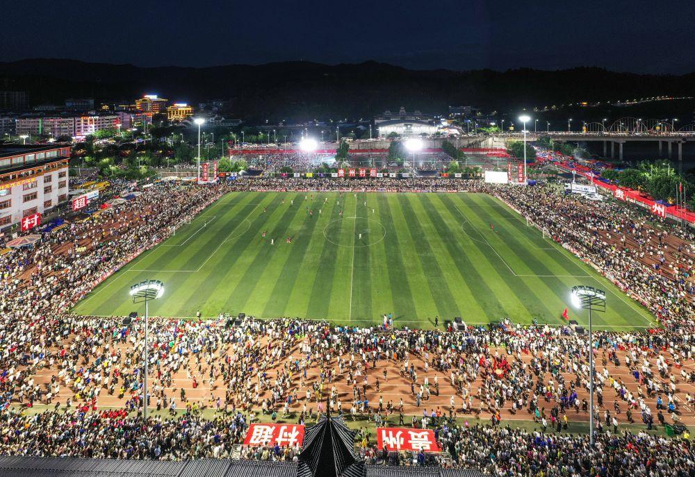 2023年7月1日,人们在观看贵州“村超”足球赛(无人机照片)。新华社记者杨文斌摄