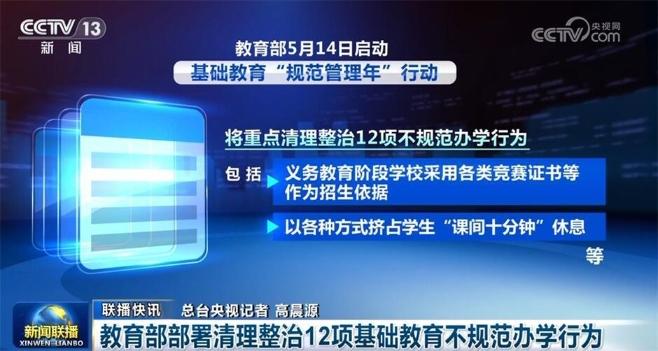 教育部5月14日启动基础教育“规范管理年”行动,将重点清理整治12项不规范办学行为,包括义务教育阶段学校采用各类竞赛证书等作为招生依据、以各种方式挤占学生“课间十分钟”休息等。教育部要求各地建立监督曝光机制,严惩触碰红线行为。