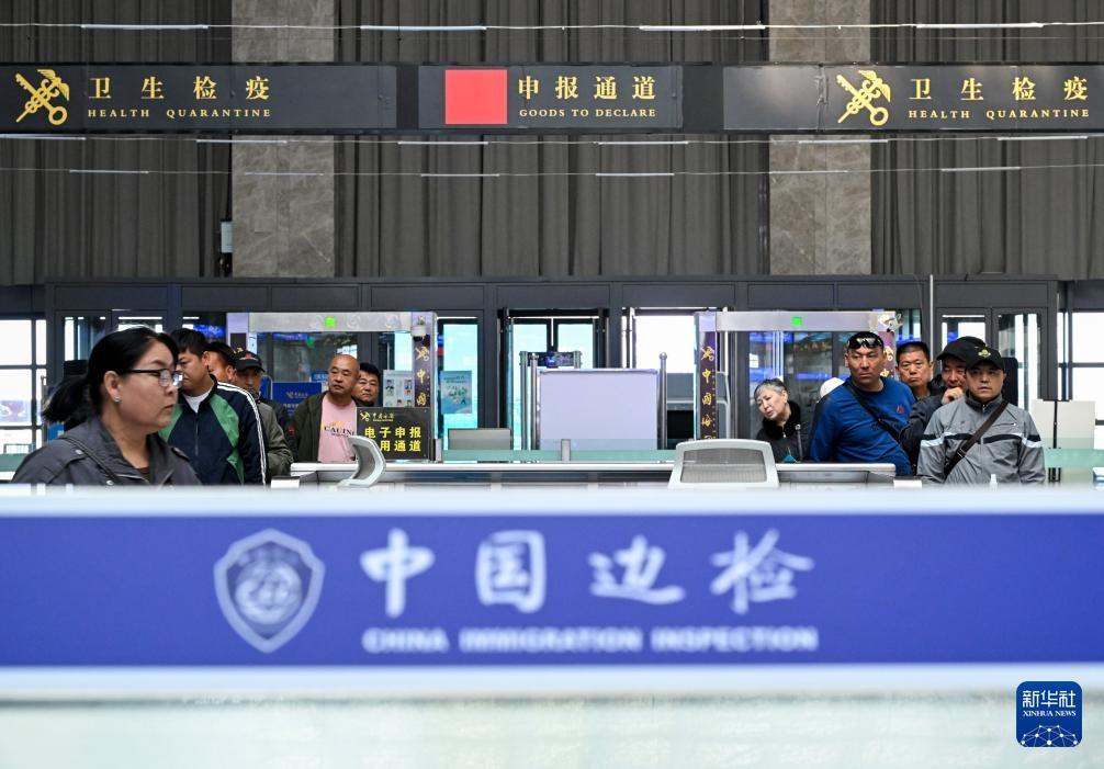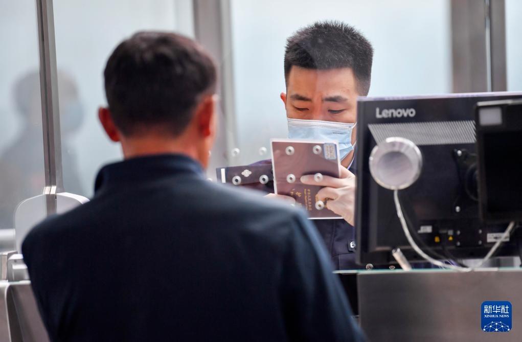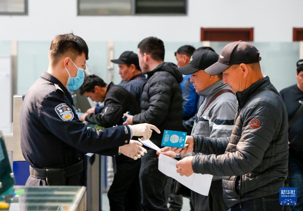 4月18日10时许,在中哈霍尔果斯国际边境合作中心联检大厅,边境警察在查验游客证件。新华社记者 赵戈 摄