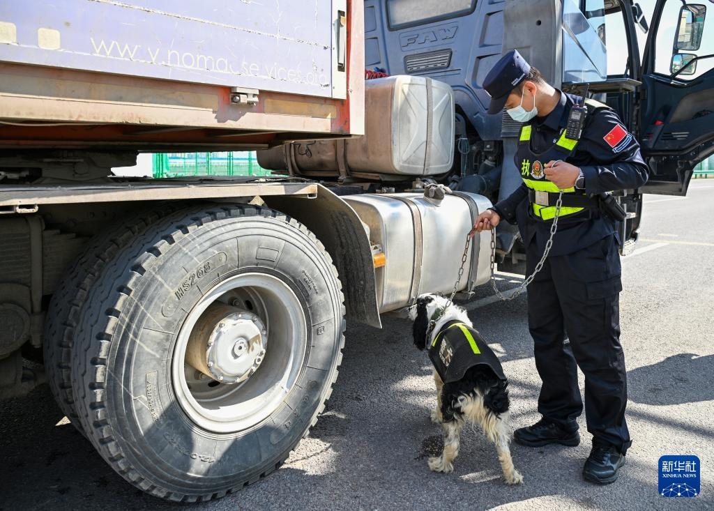 4月18日11时许,在霍尔果斯公路口岸,边检警察和警犬在查验入境车辆。新华社记者 陈朔 摄