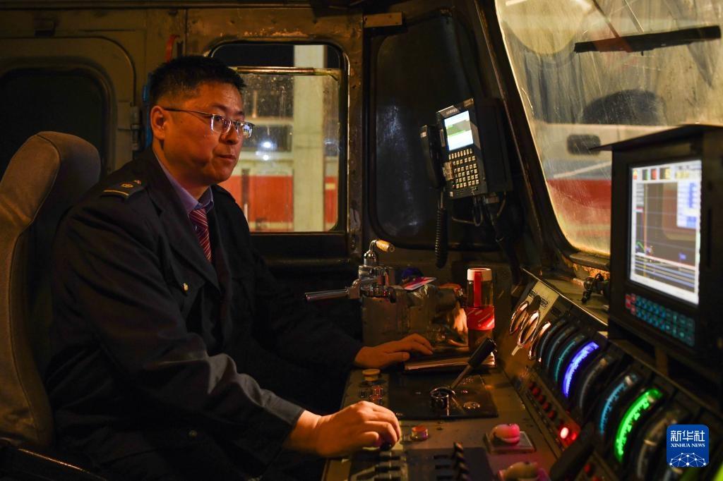 4月18日23时许,在霍尔果斯铁路口岸,火车司机童洪波驾驶一辆货运列车即将出境。新华社记者 赵戈 摄