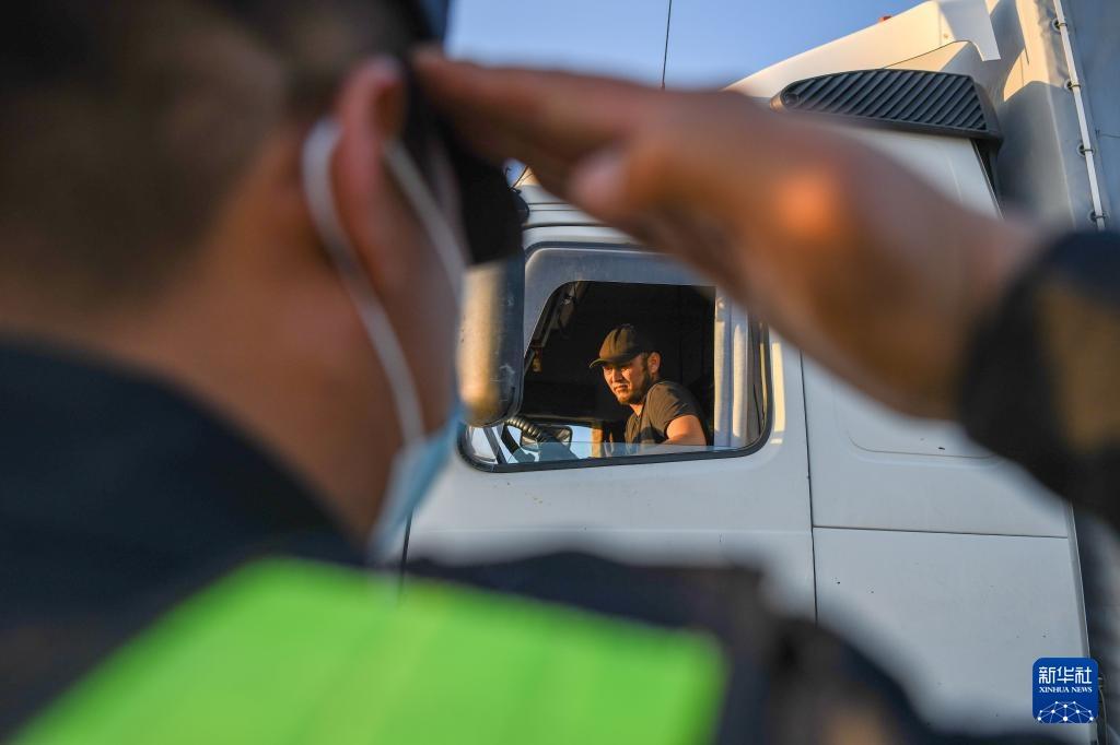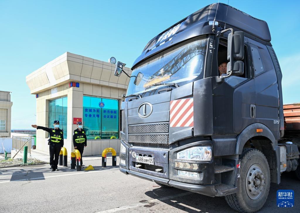 4月18日12时许,在霍尔果斯公路口岸,一辆来自哈萨克斯坦的货车通过查验站。新华社记者 陈朔 摄