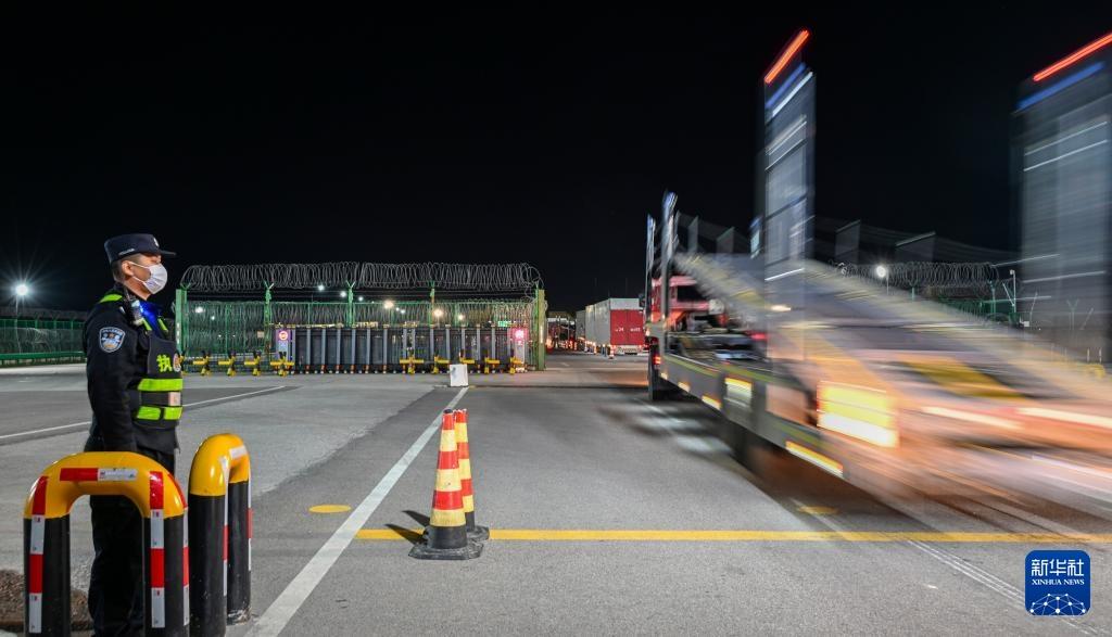 4月18日20时许,在霍尔果斯公路口岸,一辆返回哈萨克斯坦的出境车辆通过查验岗。新华社记者 赵戈 摄