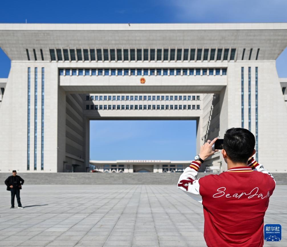 4月18日11时许,游客在霍尔果斯口岸新国门拍照留念。新华社记者 陈朔 摄