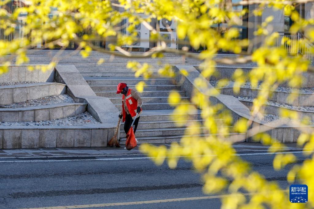 4月19日8时许,环卫工人在清扫街道。新华社记者 陈朔 摄