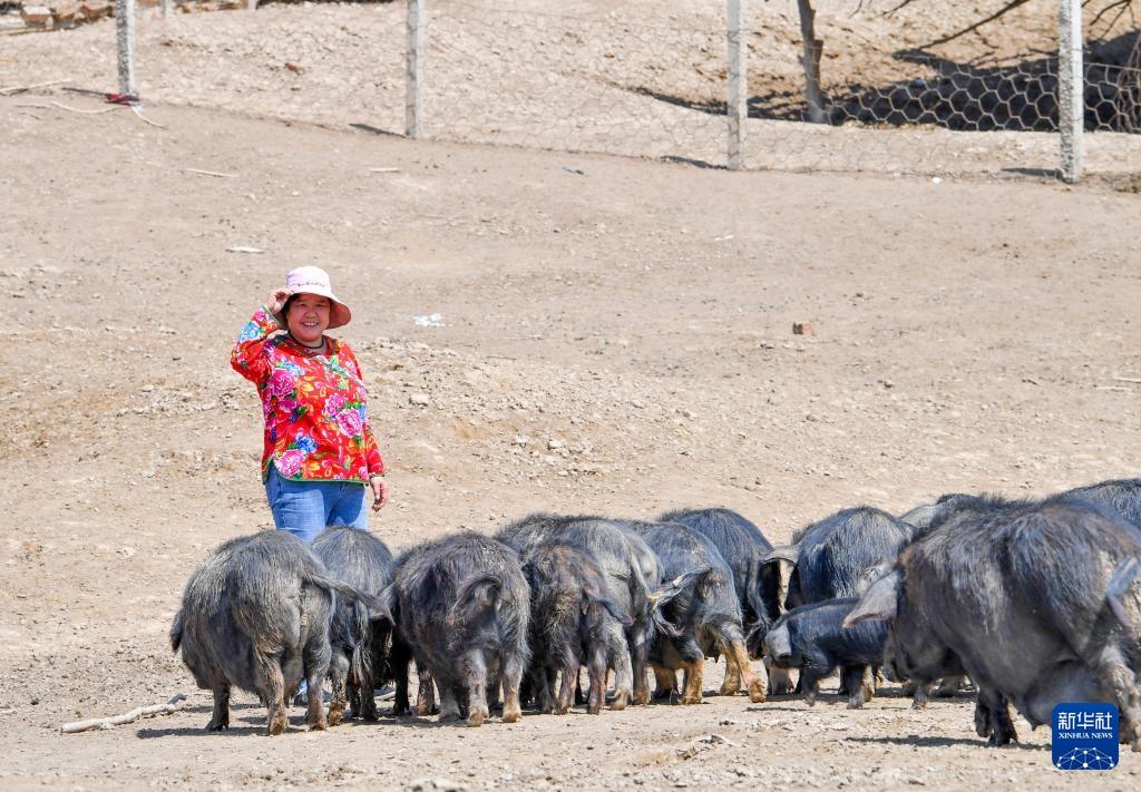 4月18日13时许,霍尔果斯市兴城街道库鲁斯社区二组的藏香猪养殖基地里,谢菊花在投喂饲料。新华社记者 赵戈 摄