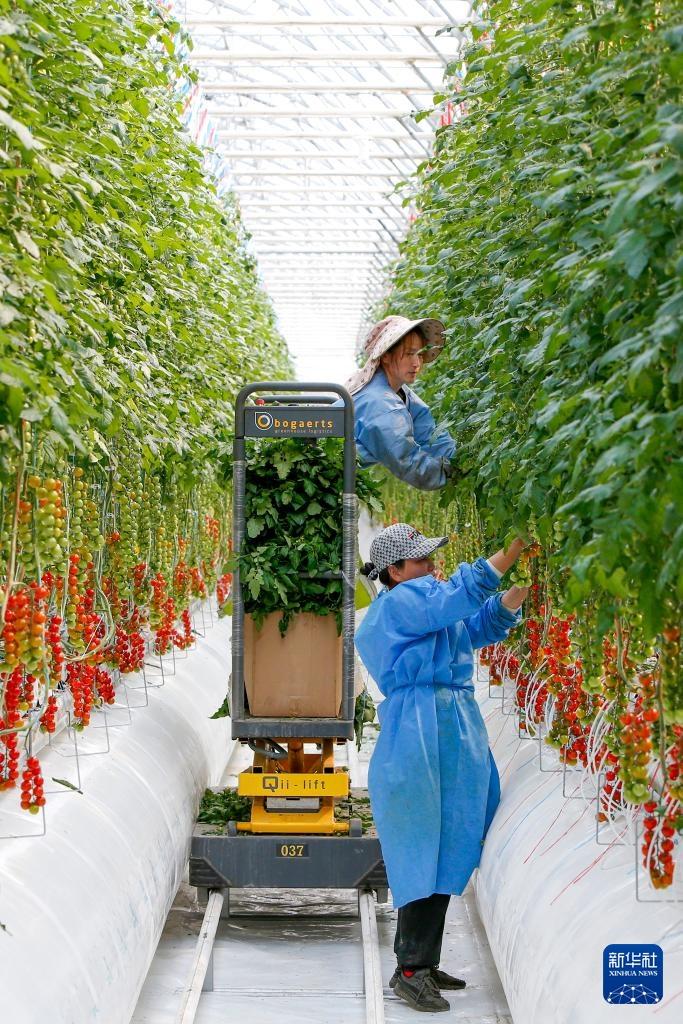4月18日17时许,在霍尔果斯市一家西红柿种植生产基地大棚,工作人员给西红柿修剪枝条。新华社记者 陈朔 摄