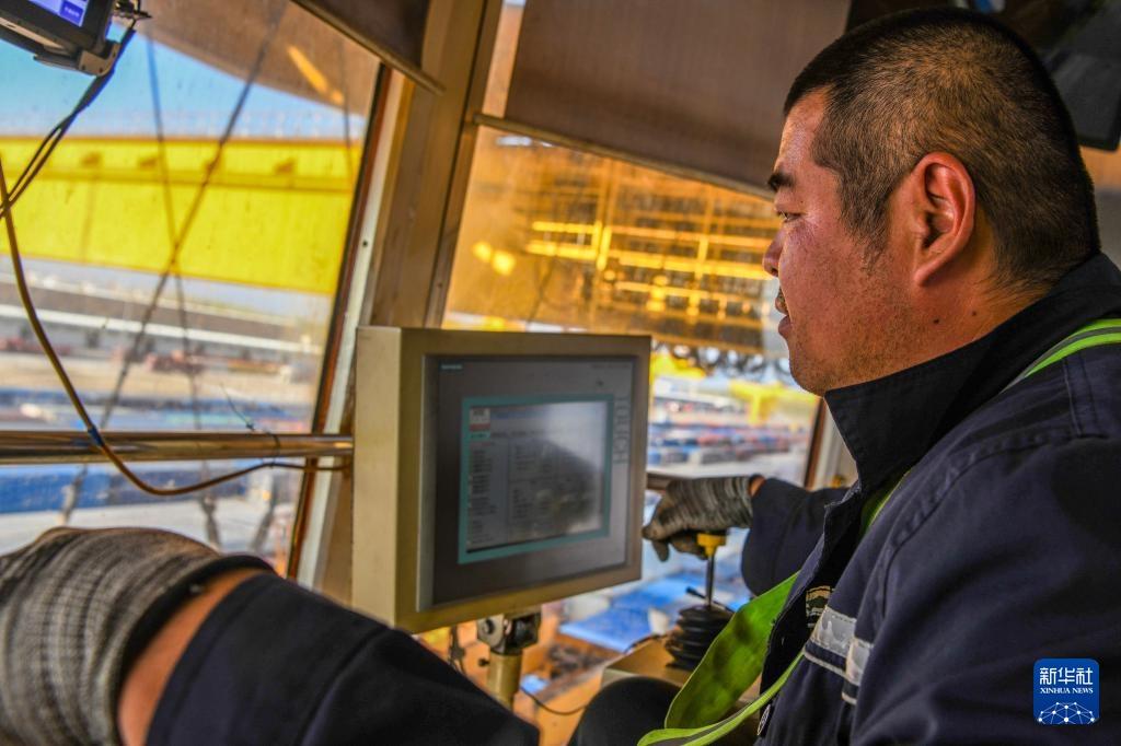 4月18日19时许,霍尔果斯铁路口岸换装场工人黄海明在驾驶吊车作业。新华社记者 赵戈 摄