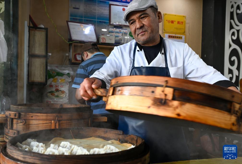 4月18日13时许,霍尔果斯市一家餐厅的厨师打开一屉包子。新华社记者 陈朔 摄