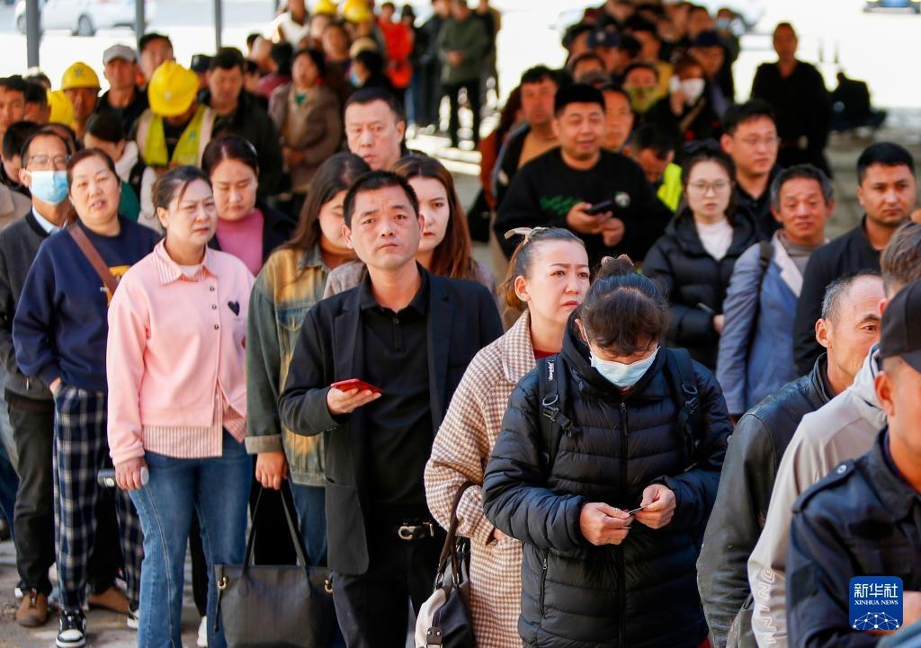 4月18日9时许,游客在中哈霍尔果斯国际边境合作中心办证大厅外排队等待。新华社记者 陈朔 摄