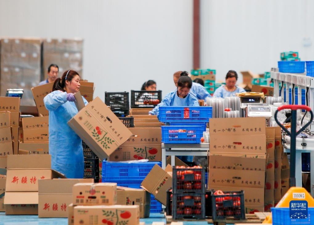 4月18日17时许,在霍尔果斯市一家西红柿种植生产基地,工作人员在打包装箱。新华社记者 陈朔 摄