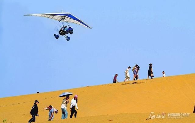 近日,在尉犁县罗布人村寨景区,一架滑翔机从沙山上空飞过。近年来,尉犁县以服务游客、方便游客、提升游客体验感为目标,增加露营地、水上汽艇、滑翔机体验等项目,以优质服务迎接八方游客。汪志鹏摄