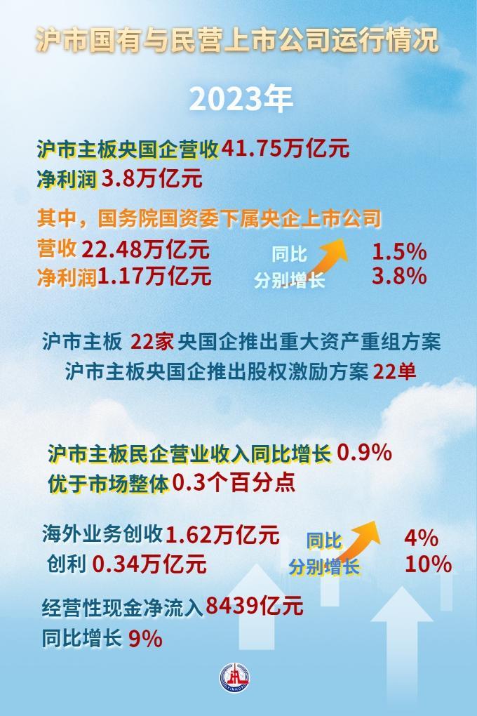 2023年,沪市主板央国企合计实现营收41.75万亿元,实现净利润3.8万亿元。其中,国务院国资委下属央企上市公司实现营收22.48万亿元,净利润1.17万亿元,同比分别增长1.5%和3.8%。