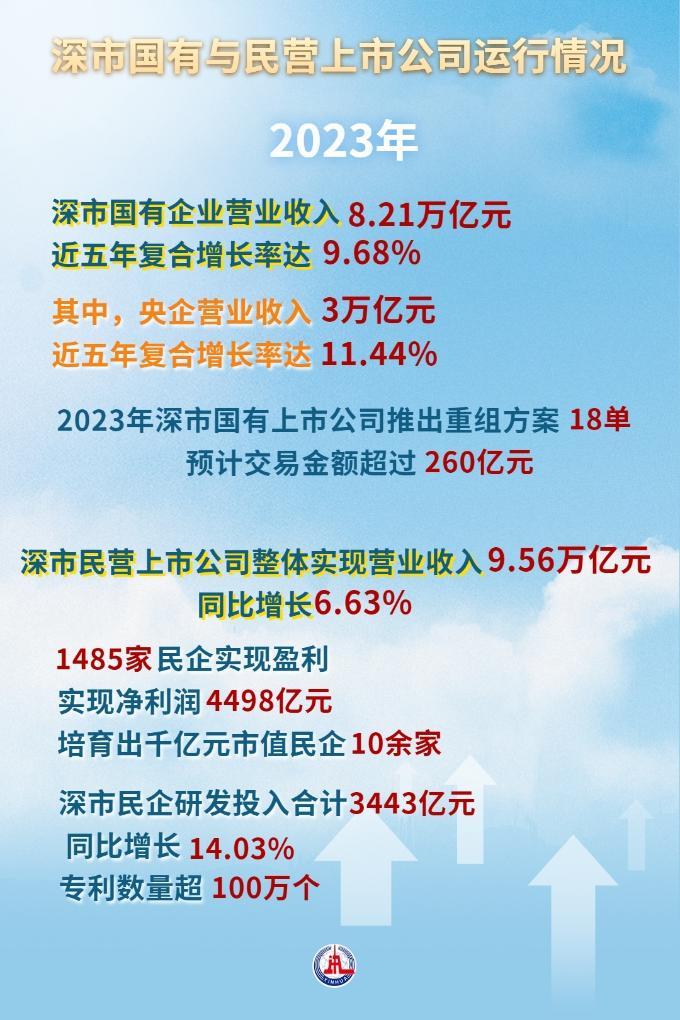 深市方面,年报数据也体现了国企核心竞争力的增强:2023年国有企业营业收入8.21万亿元,近五年复合增长率达9.68%;其中,央企营业收入3万亿元,近五年复合增长率达11.44%。
