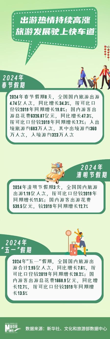2024年春节假期8天,全国国内旅游出游4.74亿人次;清明节假期3天,全国国内旅游出游1.19亿人次;“五一”假期全国国内旅游出游2.95亿人次......