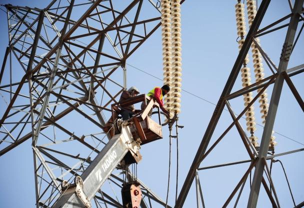 2021年12月8日,工人在叙利亚南部德拉省维修高压电线路。新华社发,阿马尔·萨法尔贾拉尼摄