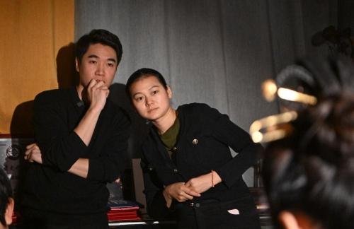 马赛(右)和女朋友闵方苹(左)在工作室内讨论设计稿(3月19日摄)。新华社记者 李然 摄