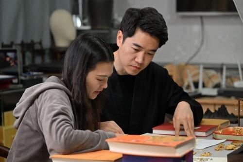 马赛(左)在工作室内与女朋友闵方苹在汉服爱好者佩戴头饰时商讨制作细节(3月7日摄)。新华社记者 孙凡越 摄