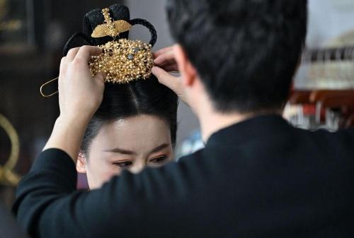 马赛在工作室内给一位汉服爱好者佩戴头饰(3月7日摄)。新华社记者 李然 摄