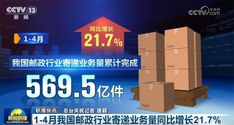 记者从国家邮政局获悉,1—4月,我国邮政行业寄递业务量累计完成569.5亿件,同比增长21.7%。其中,快递业务量累计完成508.1亿件,同比增长24.5%。