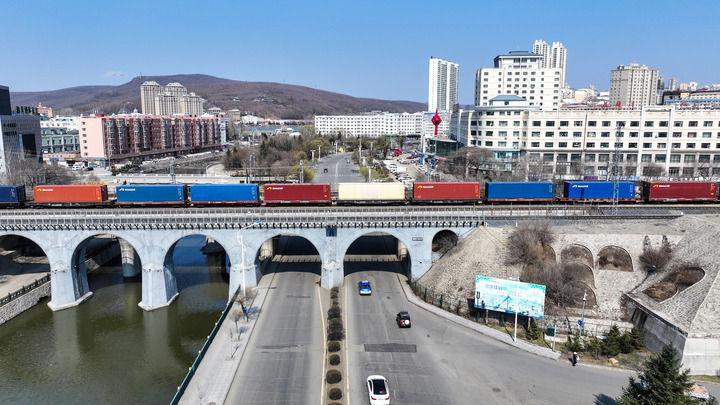 2024年4月21日,一列出境的中欧班列在黑龙江省绥芬河市区穿行(无人机照片)。新华社发(曲艺伟摄)